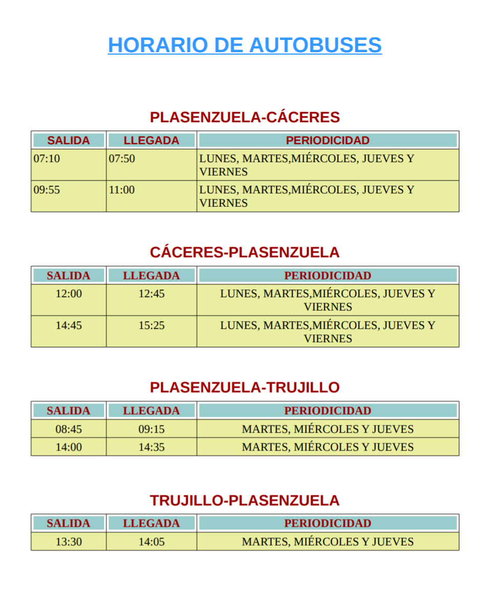 Plasenzuela cuenta con dos líneas de autobuses: una con destino a Cáceres y otra a Trujillo.